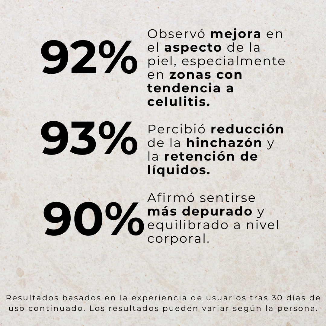No es solo un drenante o anticelulítico: Actúa de forma global, apoyando la eliminación de toxinas y líquidos y mejorando la apariencia de la piel.
